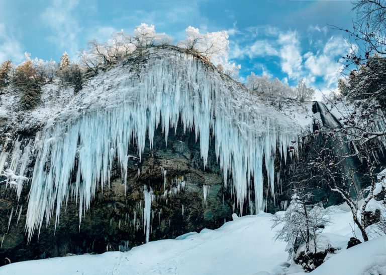 Randonner autour des lacs et découvrez de magnifiques cascades enneigées.